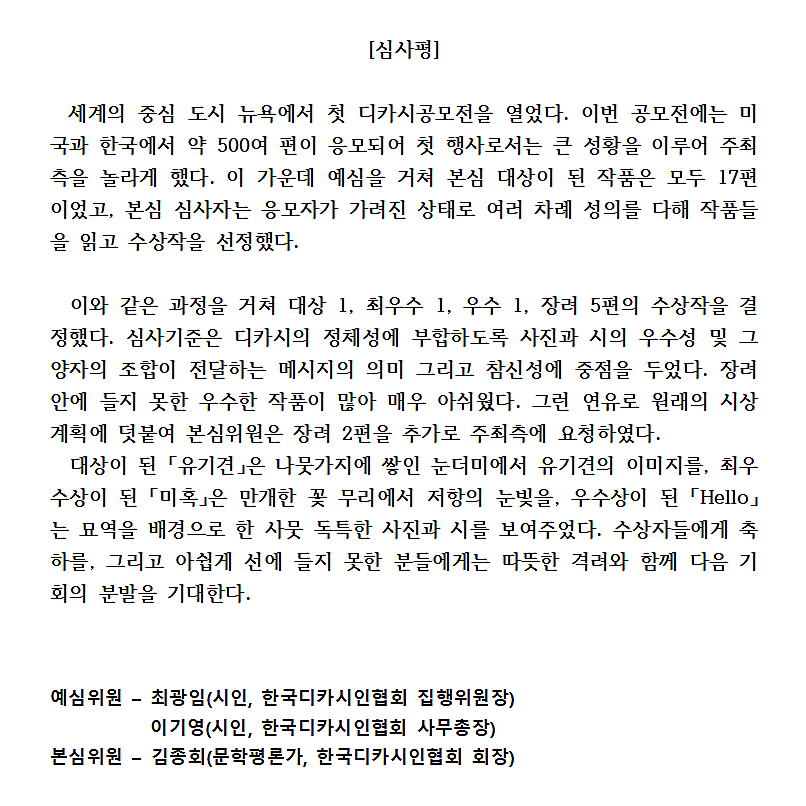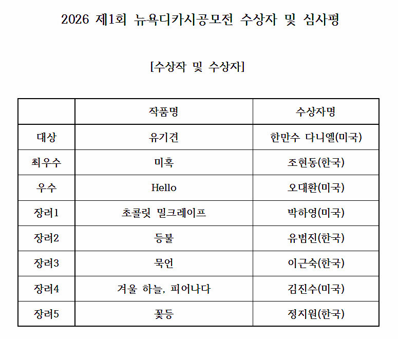 페이지 정보 작성자 관리자 댓글 0건 조회 7회 작성일 26-04-08 16:28 목록 본문 2026 제1회 뉴욕디카시공모전 수상자 및 수상작 발표 . 이전글2026 제1회 뉴욕디카시공모전 수상작 8편 26.04.08 다음글2026 춘천 디카시 공모전 안내 26.03.31 목록